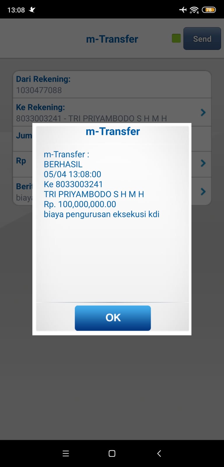 Alwi Lie yang diduga sebagai korban, menyampaikan, pihaknya telah menyetor uang sebesar Rp.850 juta. Dimana Rp.500 juta diberikan kepada Try Priyambodo melalui transfer ke rekening pribadi Try Priyambodo, sisahnya Rp.350 juta diberikan secara tunai. Dana tersebut diserahkan melalui orang kepercayaan Try Priyambodo bernama Heri. Dan Heri pula yang menghubungkan Alwi Lie dan Try Priyambodo saat itu.