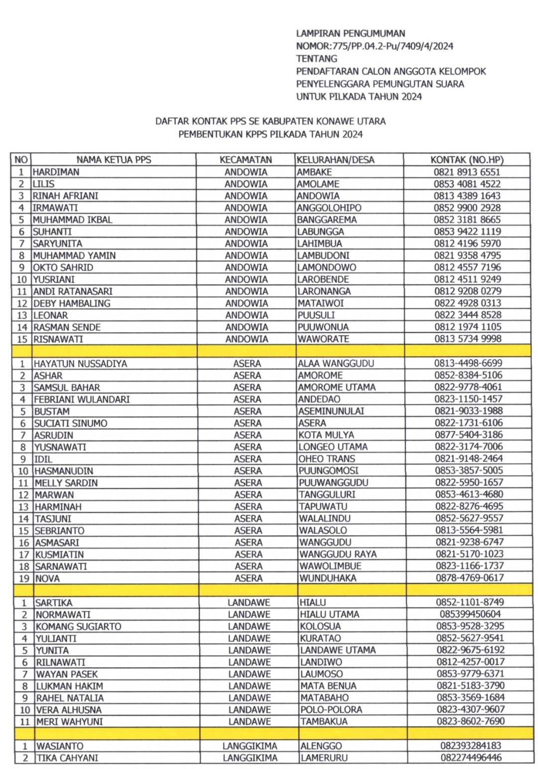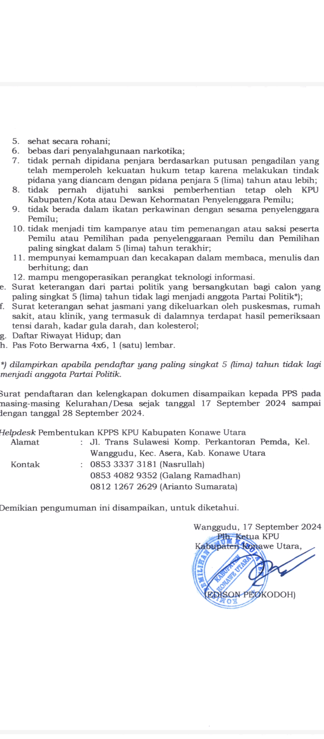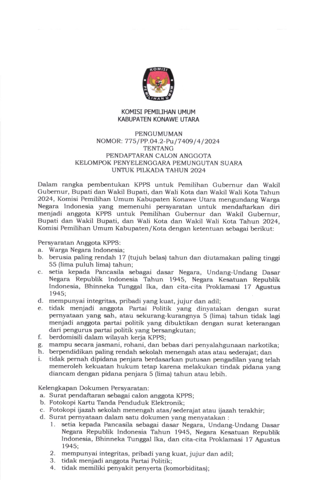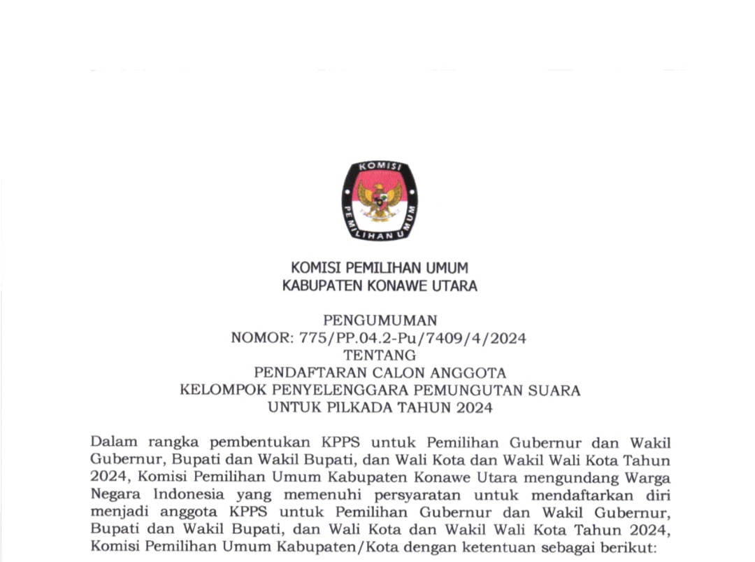 WANGGUDU, SULTRAEKSPRES.COM– Komisi Pemilihan Umum (KPU) Kabupaten Konawe Utara (Konut) mengumumkan pendaftaran Calon Anggota Kelompok Penyelenggara Pemungutan Suara (KPPS) untuk Pilkada Tahun 2024.