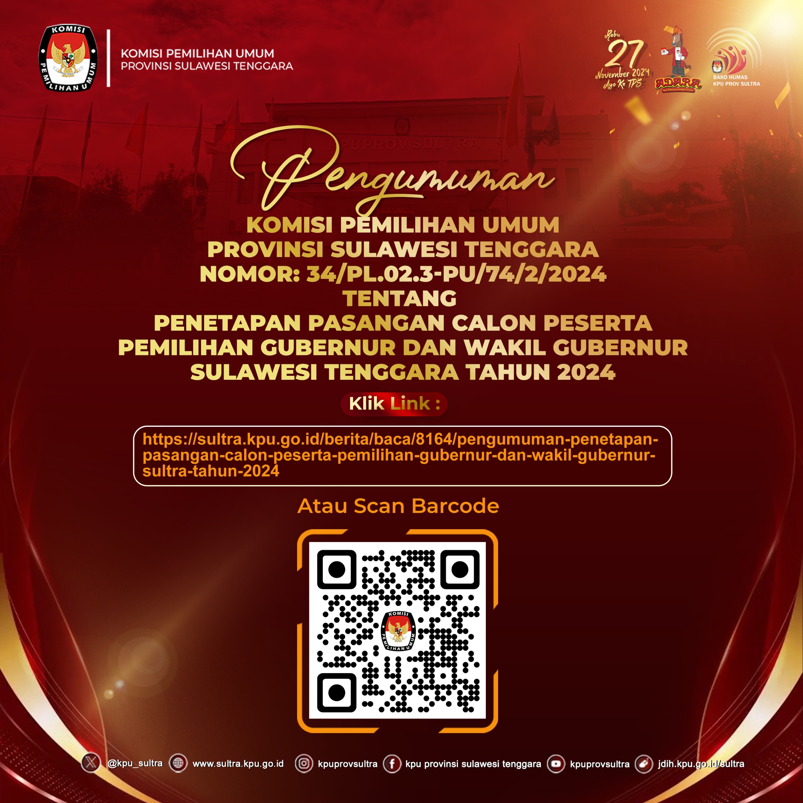 berikut Pengumuman Nomor 34/PL.02.3-Pu/74/2/2024 tentang Penetapan Pasangan Calon Peserta Pemilihan Gubernur dan Wakil Gubernur Sulawesi Tenggara Tahun 2024.