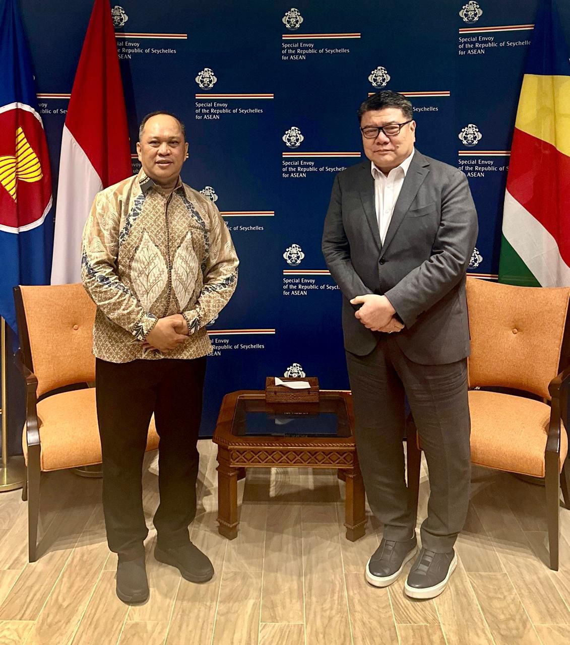 JAKARTA- Calon Gubernur Sulawesi Tenggara (Sultra), H. Ruksamin, menghadiri undangan makan malam resmi di kantor Special Envoy of President Seychelles ( SEPS) untuk ASEAN, H.E. Mr. Nico Barito, pada 28 September 2024.