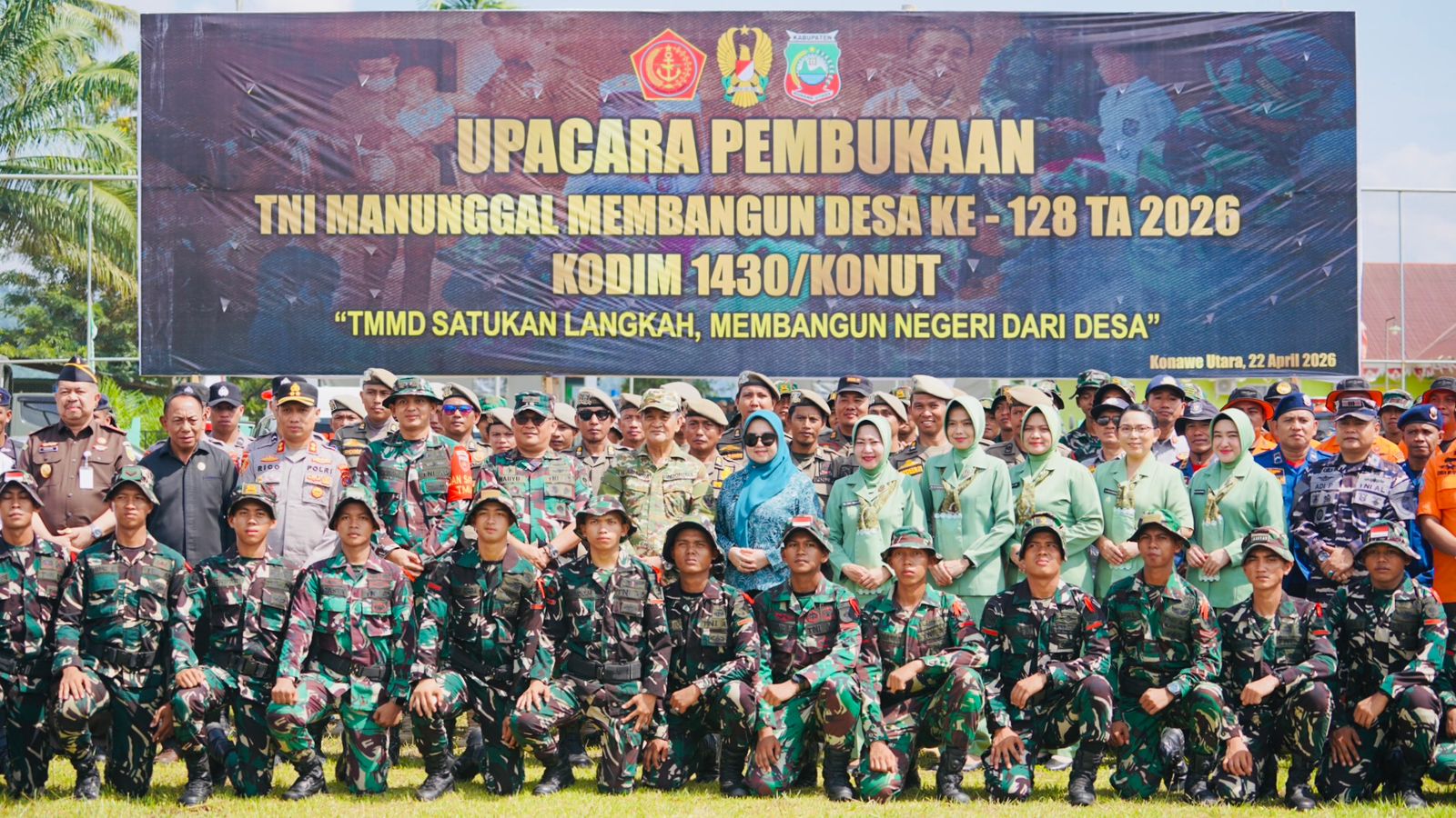 WANGGUDU, SULTRAEKSPRES.COM – Kolaborasi lintas sektor kembali digelorakan di Konawe Utara melalui pembukaan TMMD ke-128, sebagai upaya konkret mempercepat pembangunan desa sekaligus memperkuat kemanunggalan TNI dan rakyat. Upacara pembukaan berlangsung khidmat di Lapangan Ladasi, Kelurahan Andowia, Kecamatan Andowia, (22/04/2026).